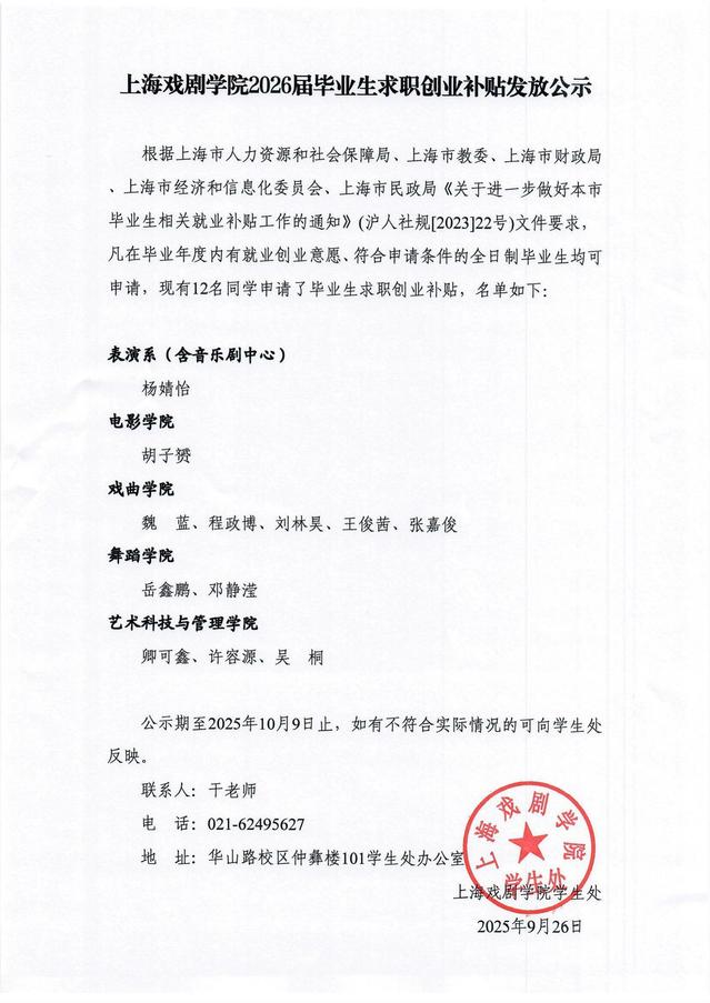 上海戏剧学院2026届毕业生求职创业补贴发放公示